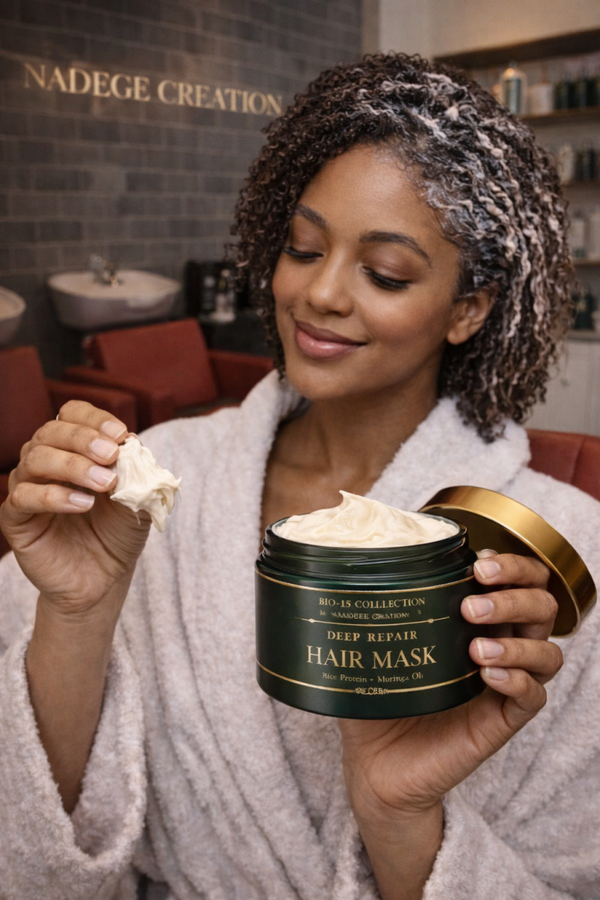 Created by Nadege Creation Hair Salon, this luxury hair mask penetrates deep into the hair shaft to strengthen strands, nourish the scalp, and improve elasticity. The result is softer, stronger, healthier hair with improved shine and manageability.