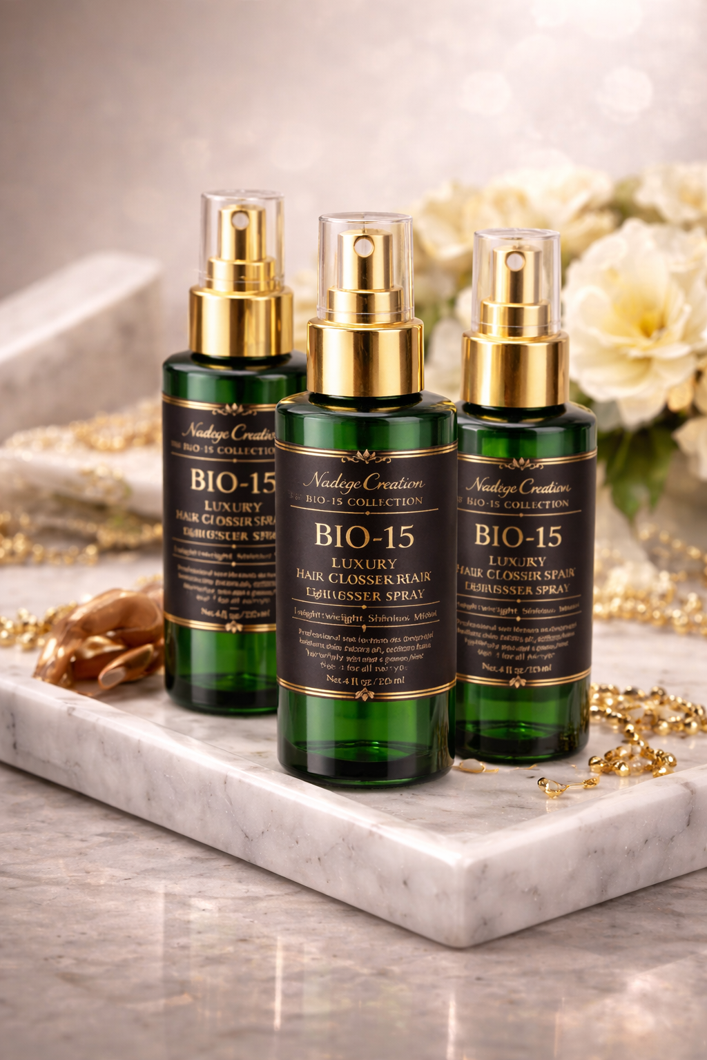 Bio-15 Luxury Hair Glosser Spray is part of the Bio-15 Collection by Nadege Creation, a premium hair care line inspired by natural ingredients and professional salon expertise.