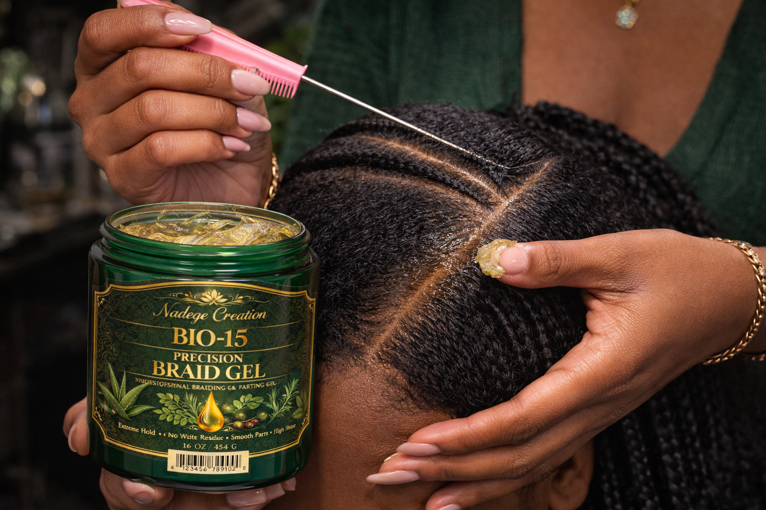 Developed by Nadege Creation, this high-performance formula delivers extreme hold without flaking or white residue, allowing stylists to achieve clean sections, smooth roots, and sleek finishes for every braid style.