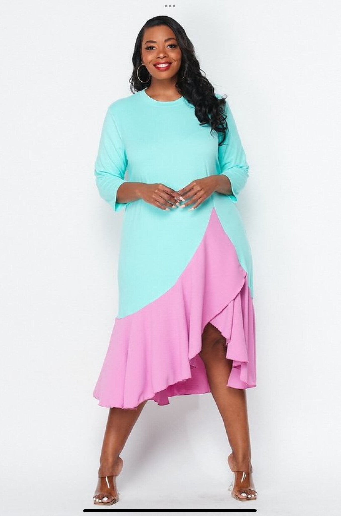 This mint and blush flowy dress is the perfect mix of comfort and style. Designed with a relaxed fit and a beautiful asymmetrical hem, it gives you that effortless, graceful movement while keeping you chic and put together. Perfect for brunch, church, events, or a stylish everyday look.