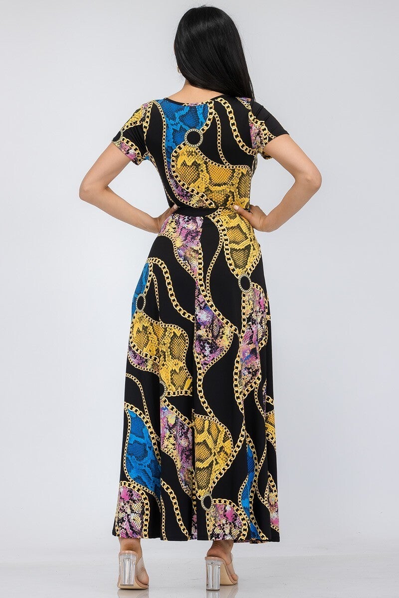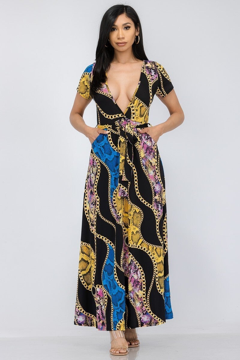 This statement maxi dress is made for the woman who loves to stand out. Featuring a deep V neckline, a flattering waist tie, and a flowy silhouette, it combines elegance with a fierce, eye-catching print. Perfect for vacations, brunch, events, or when you want all eyes on you.