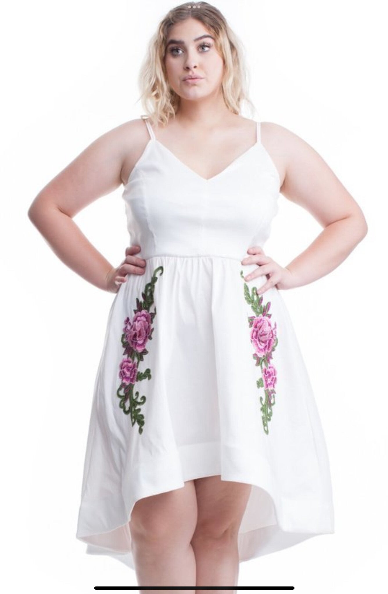 This white floral dress is the perfect blend of elegance and charm. Featuring delicate embroidered rose details, a flattering waistline, and a flowy high-low silhouette, it gives you that light, graceful look for any occasion. Perfect for brunch, special moments, or when you want to feel pretty and confident.